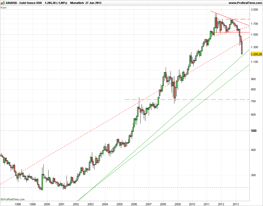 | Gold Unze USD – Langfristchart, Monatsdaten (Quelle: Prorealtime) |